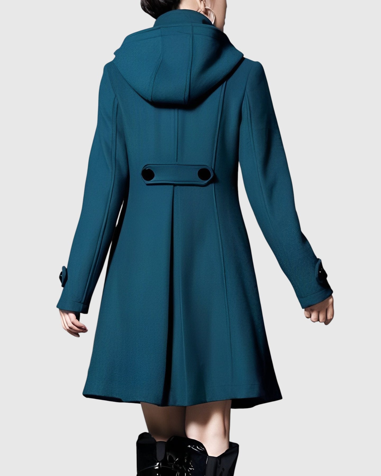 Дамско палто с разширен (A-line) крой, висока яка и регулируема качулка. Отпред двуредно закопчаване и практични джобове с клапи. По-здрава, меката тъкан запазва формата си без излишно тегло, средната дължина оптически удължава силуета. Маншети с декоративна лента, прецизна изработка и удобна подплата. Универсален избор за града, работа и уикенд — прекрасно се комбинира с рокли, поли и дънки и изпъква с ботуши.